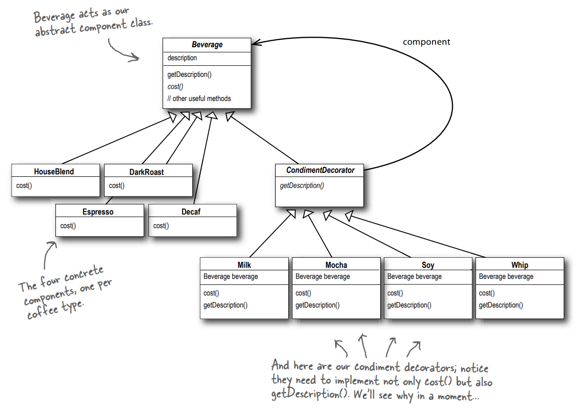 Beverage를 상속한 CondimentDecorator를 상속하는 Decorator 들로 역할을 나눕니다.