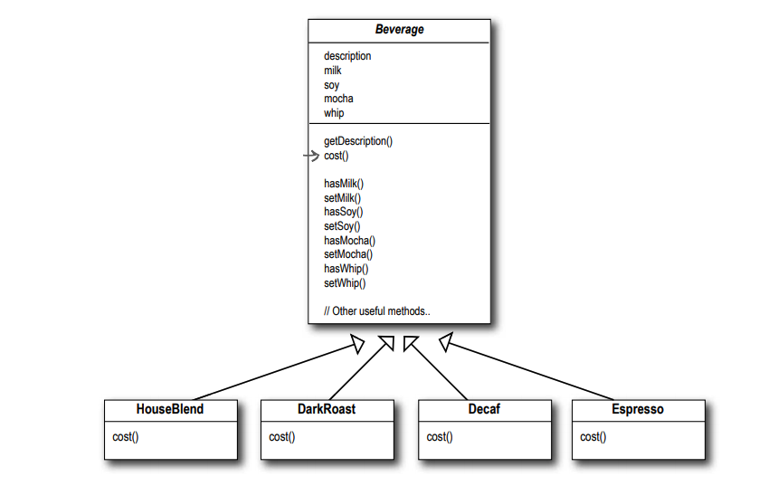 Beverage를 상속하는 클래스가 꼭 가져야할 메소드인 cost 함수가 abstract 로 정의되어 있습니다.