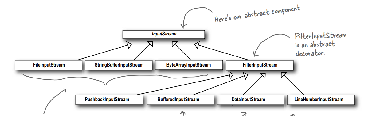 다른 데코레이터들을 추가하여 확장시켜, 서로 다른 유형의 I/O에 대해 응답해주는 객체가 구현되어 있다고 합니다.