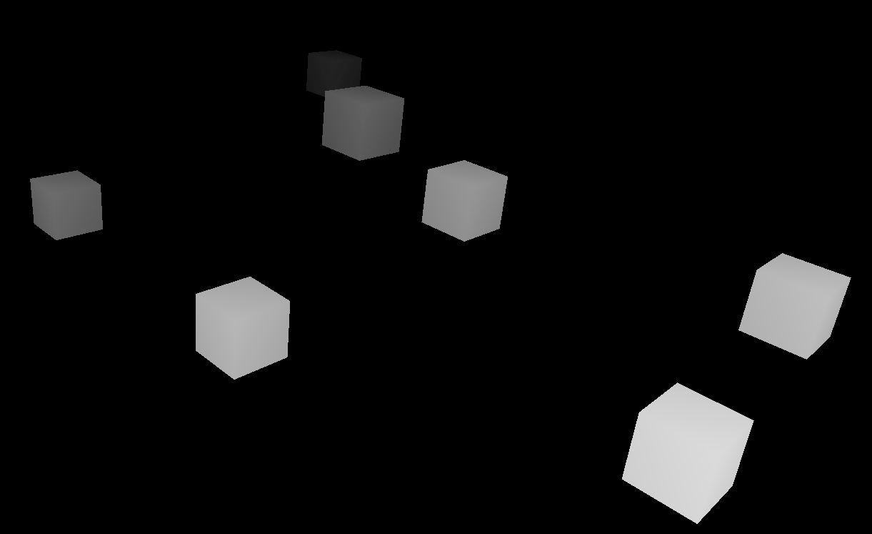 AmbientLight를 준 상태에서 DepthMaterial은 디음과 같이 카메라와의 거리에 따라 색상이 달라보인다.