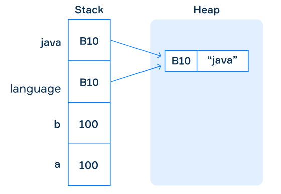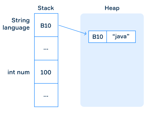 Reference Type의 대표적인 것으론 String이 있다. String이 생성될 때 값은 Heap에 존재하게 되고, 변수영역엔 그 Heap의 주소값이 들어가게 된다.